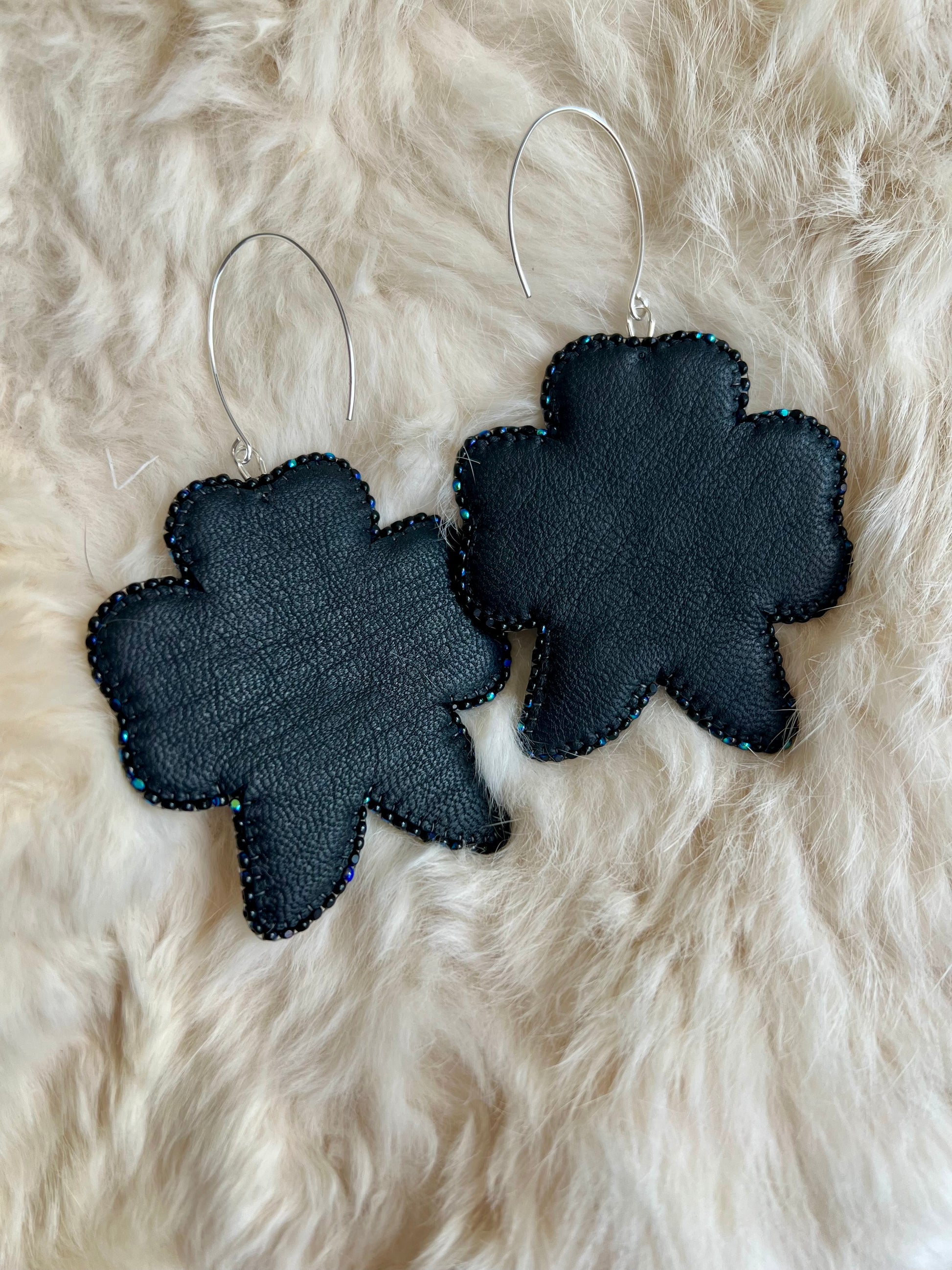 These earrings are 3.5" x 2" including sterling silver hooks. Backed with black commercial deer leather.