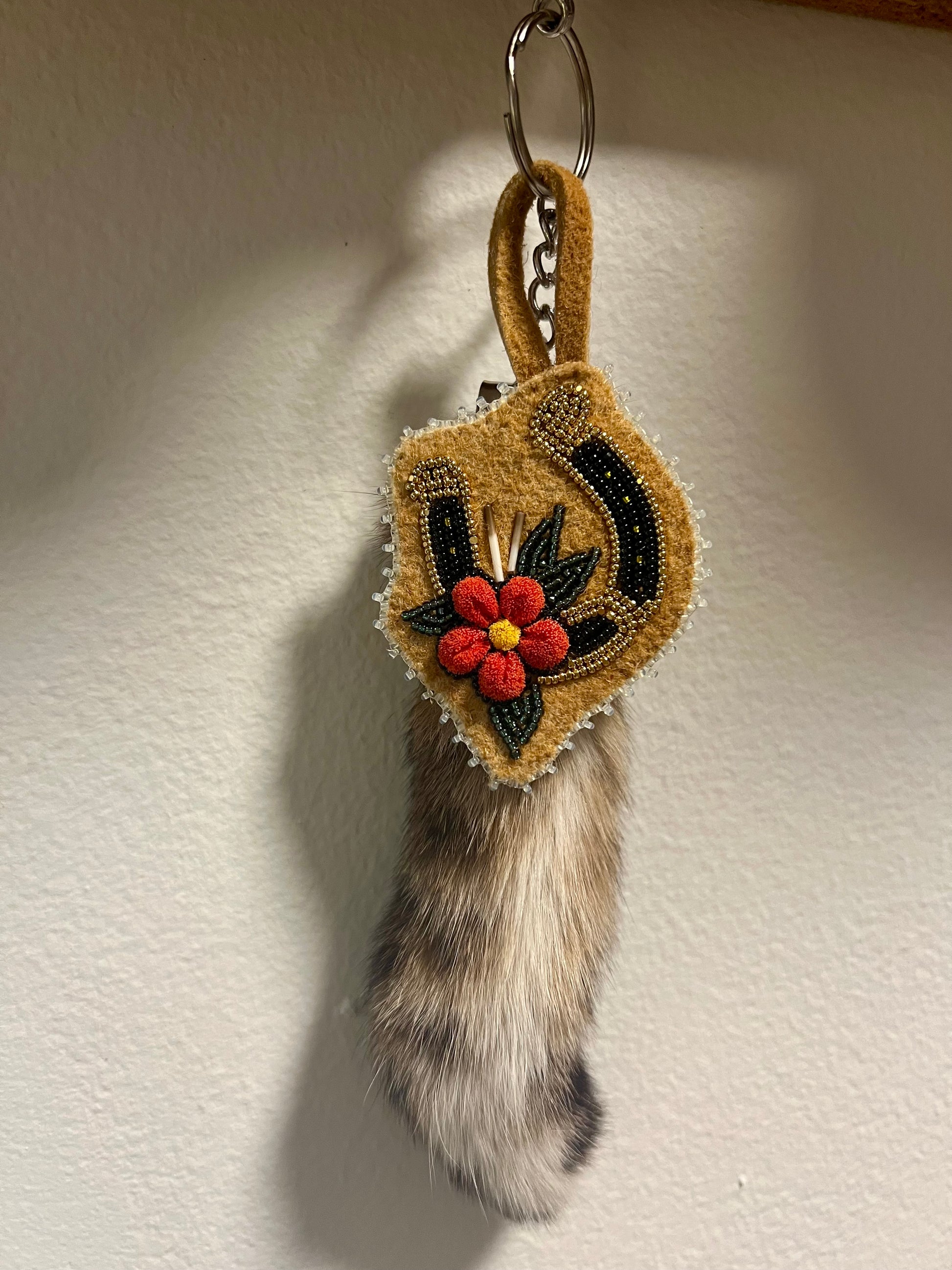 This hand beaded purse charm is beaded directly onto home smoked moose hide, 24km gold plated Charlotte size 15 beads. This piece is backed with home smoked deer hide and has a tufted caribou hair floral piece detail. Comes with lynx tail attachment.