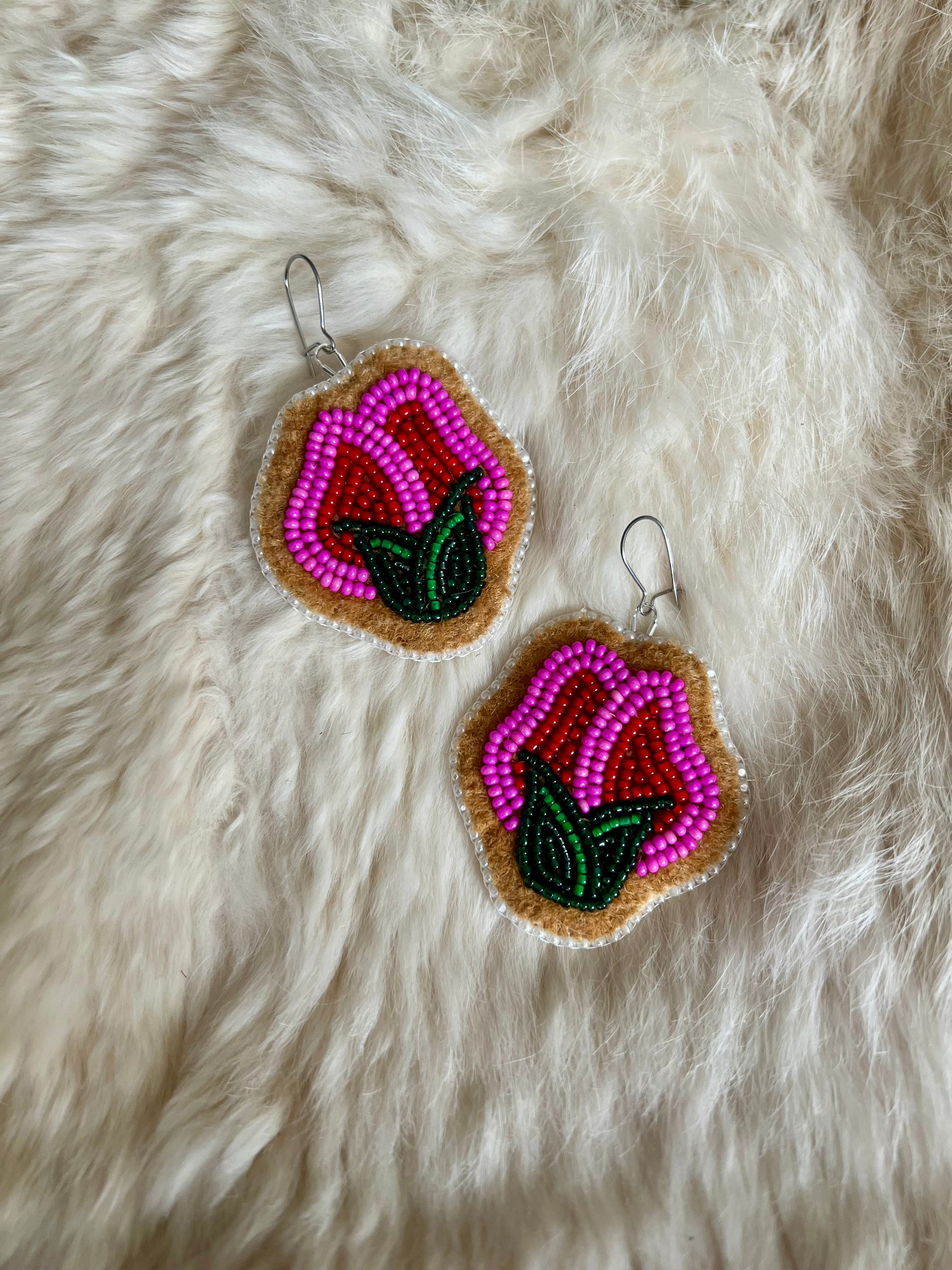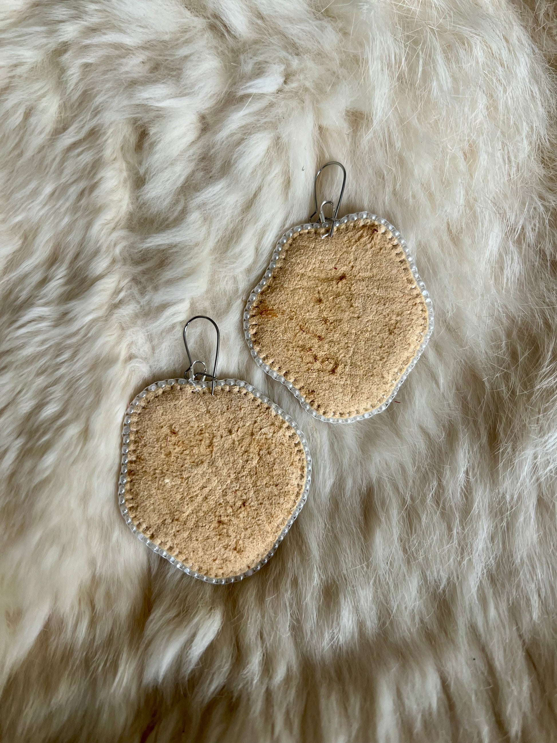 These earrings are beaded directly onto home smoked moose hide with a mix of vintage and contemporary glass seed beads, hanging on stainless steel kidney hooks. These earrings are backed with home smoked deer hide.
