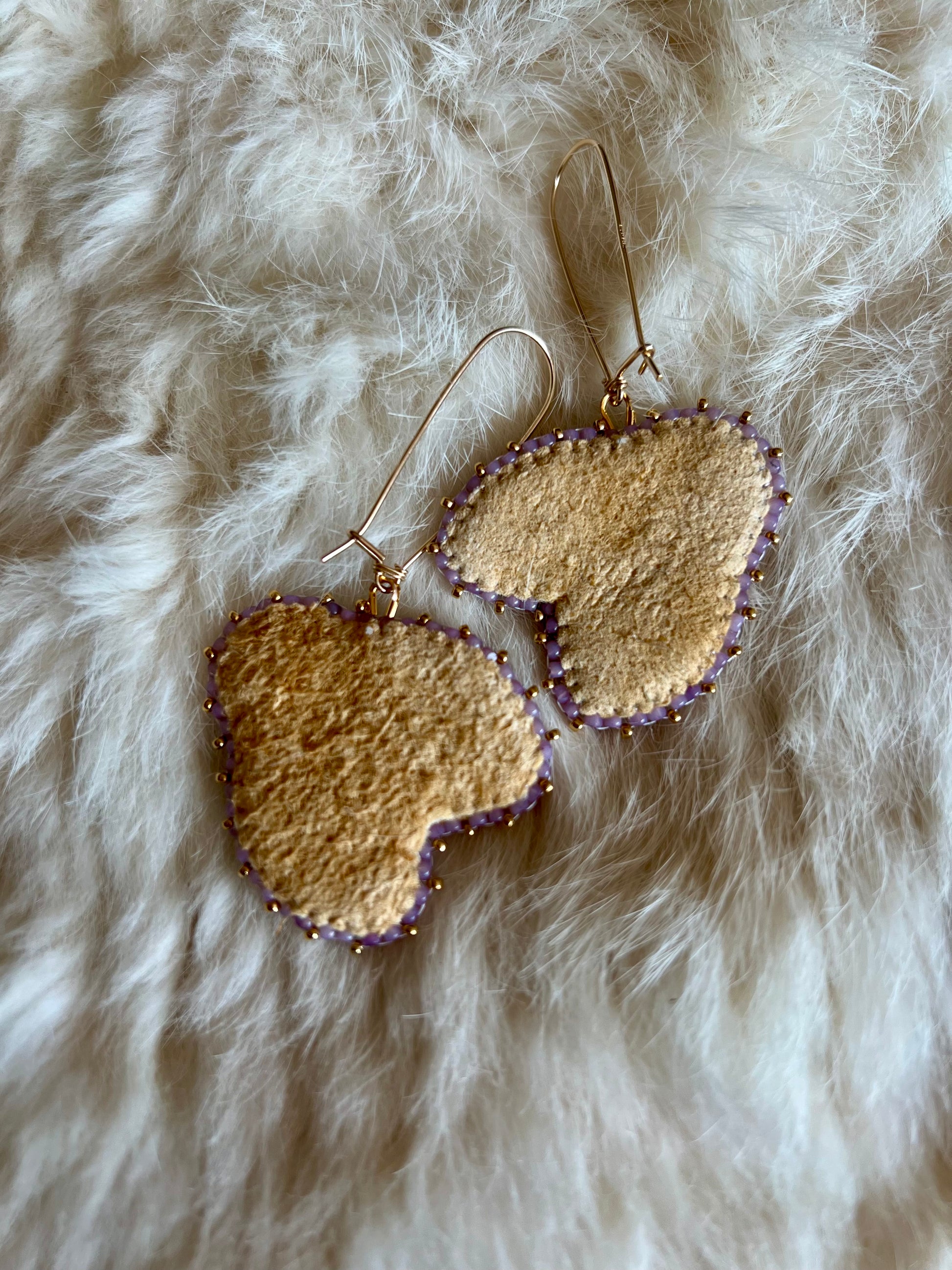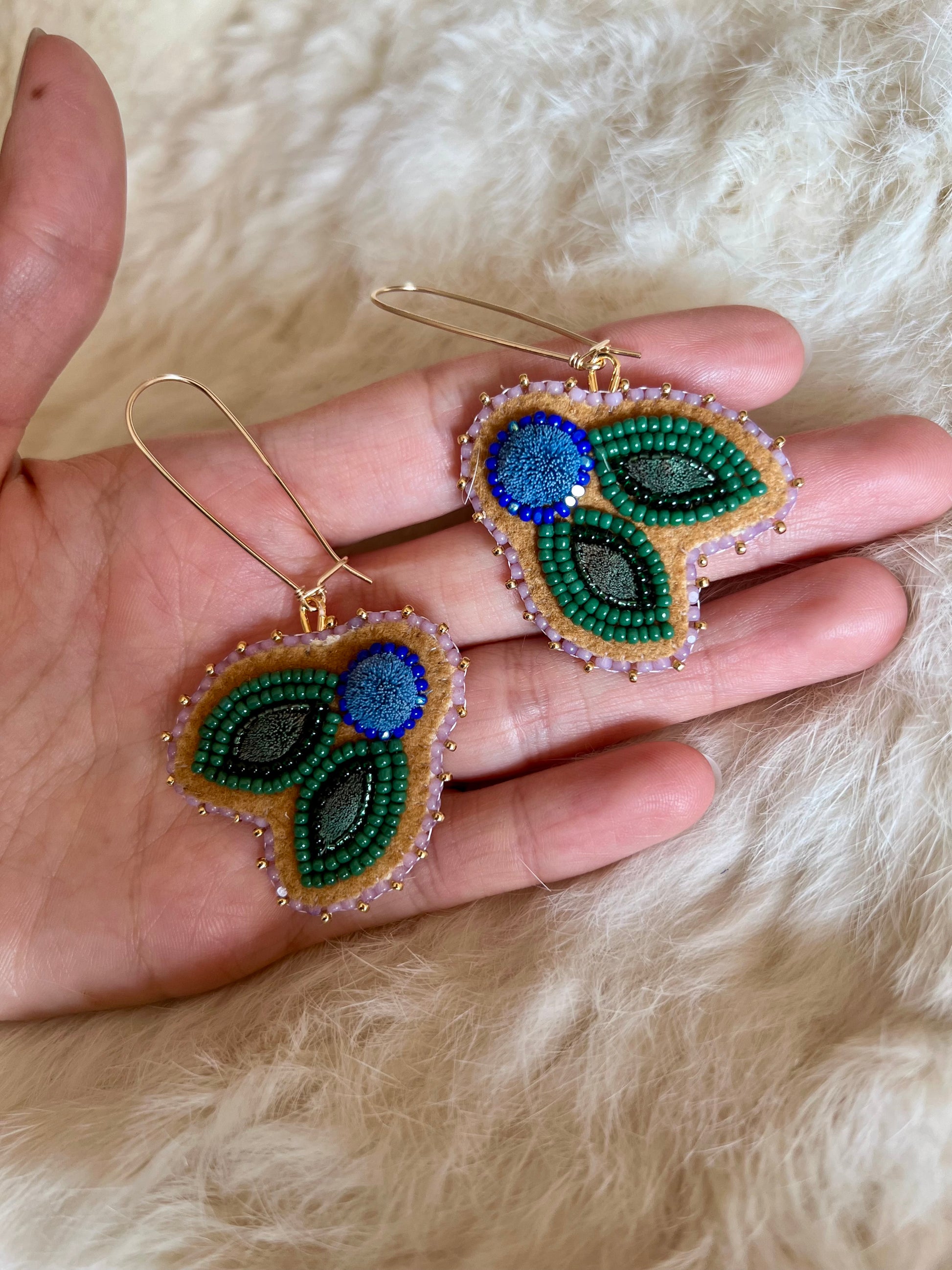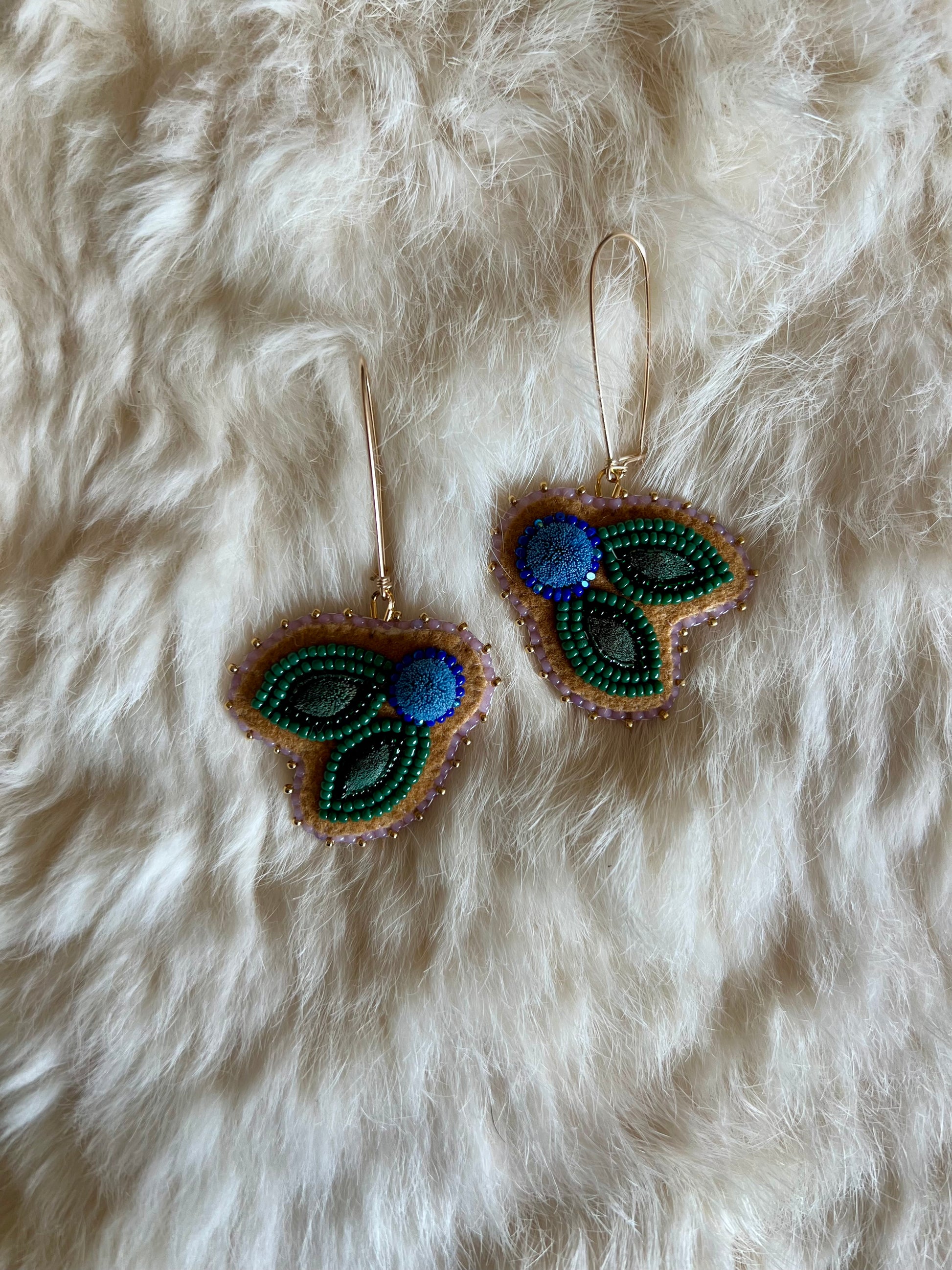 Hand beaded blueberry earrings, beaded directly onto home smoked moose hide, with three caribou hair tufts in each earring (6 in total!!!!). These earrings are made with a mix of vintage and contemporary charlotte cut glass seed beads, backed with home smoked deer hide, and hang on gold filled kidney hooks.