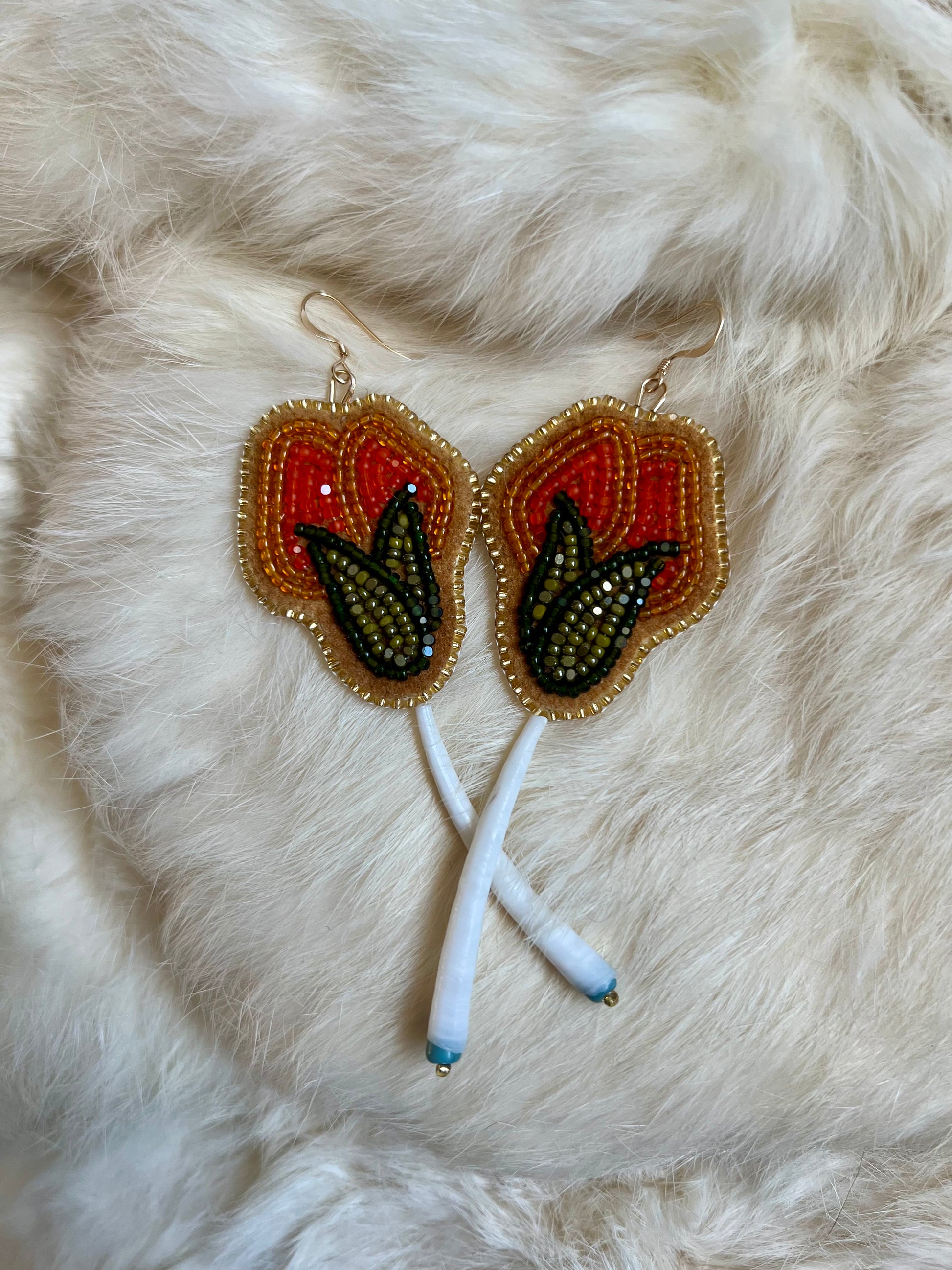 Hand beaded floral earrings, beaded with a mix of vintage and contemporary charlotte cut glass beads directly onto home smoked moose hide. These earrings are backed with home smoked deer hide & hang on gold filled hooks.