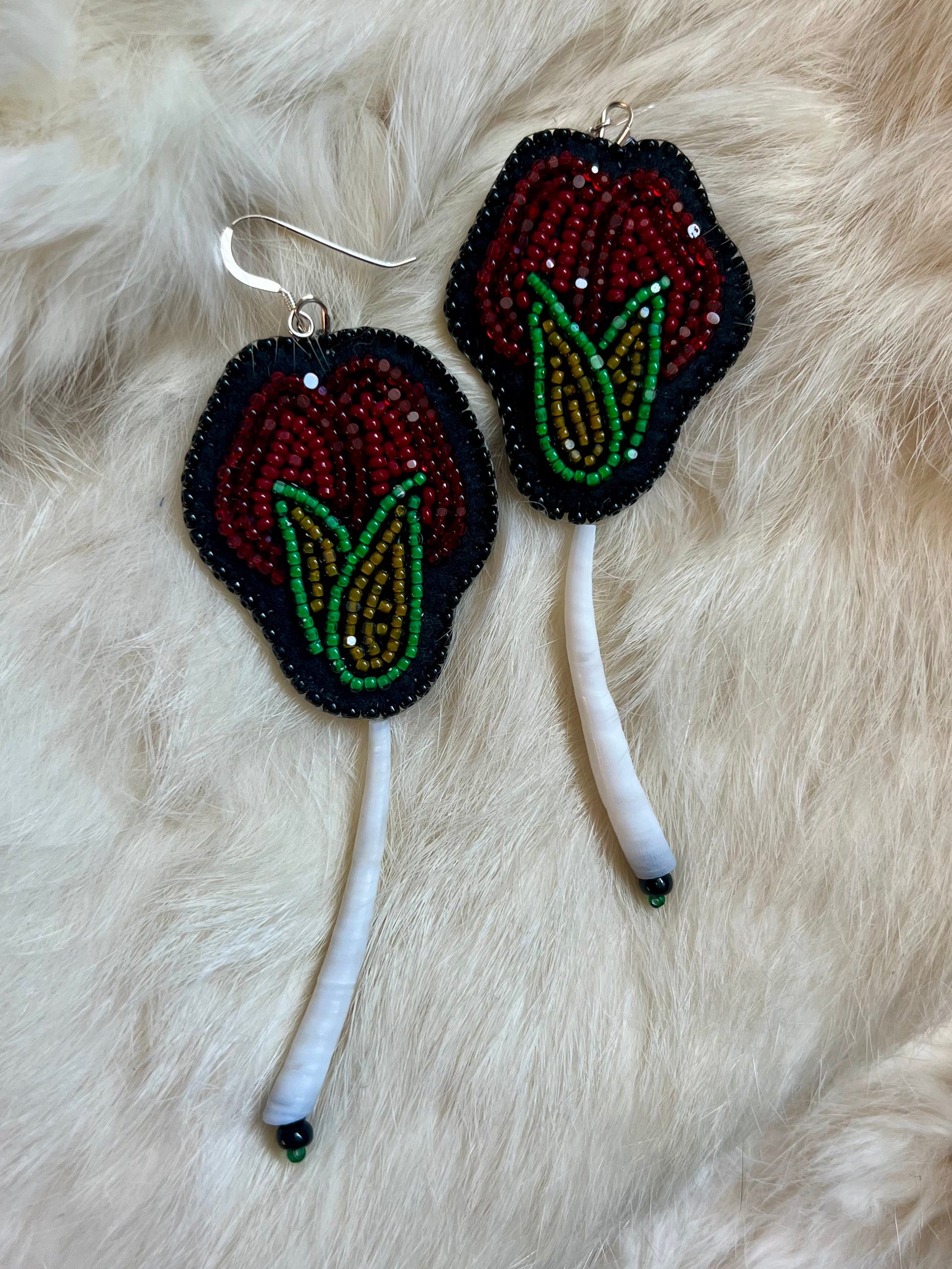 earrings are 4" long with hook and dentallium shell tassel.