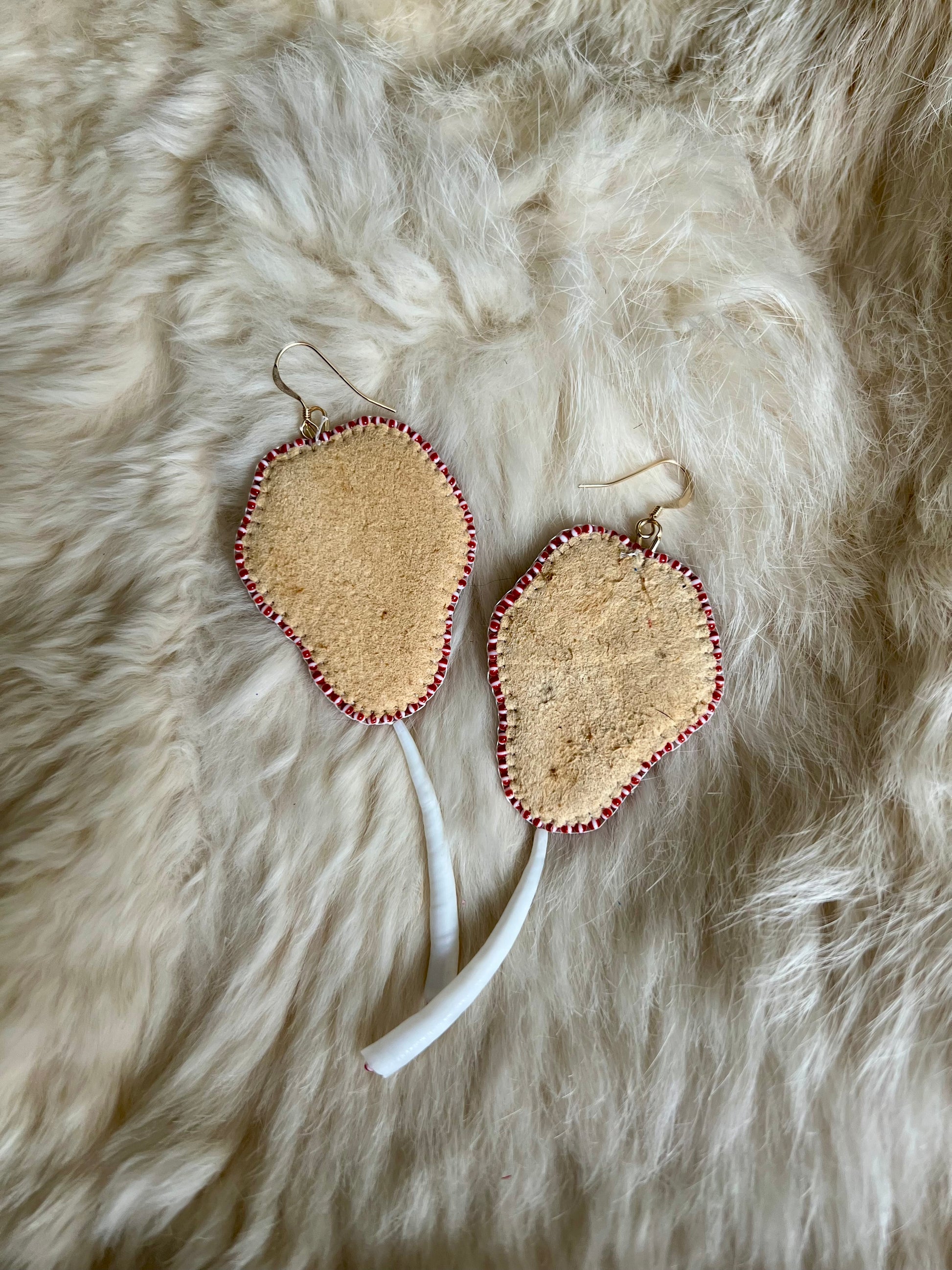 These earrings are beaded directly onto home smoked moose hide with a mostly vintage glass seed beads (dark green are contemporary), hanging on gold filled hooks. These earrings are backed with home smoked deer hide with a dentallium shell hanging detail.
