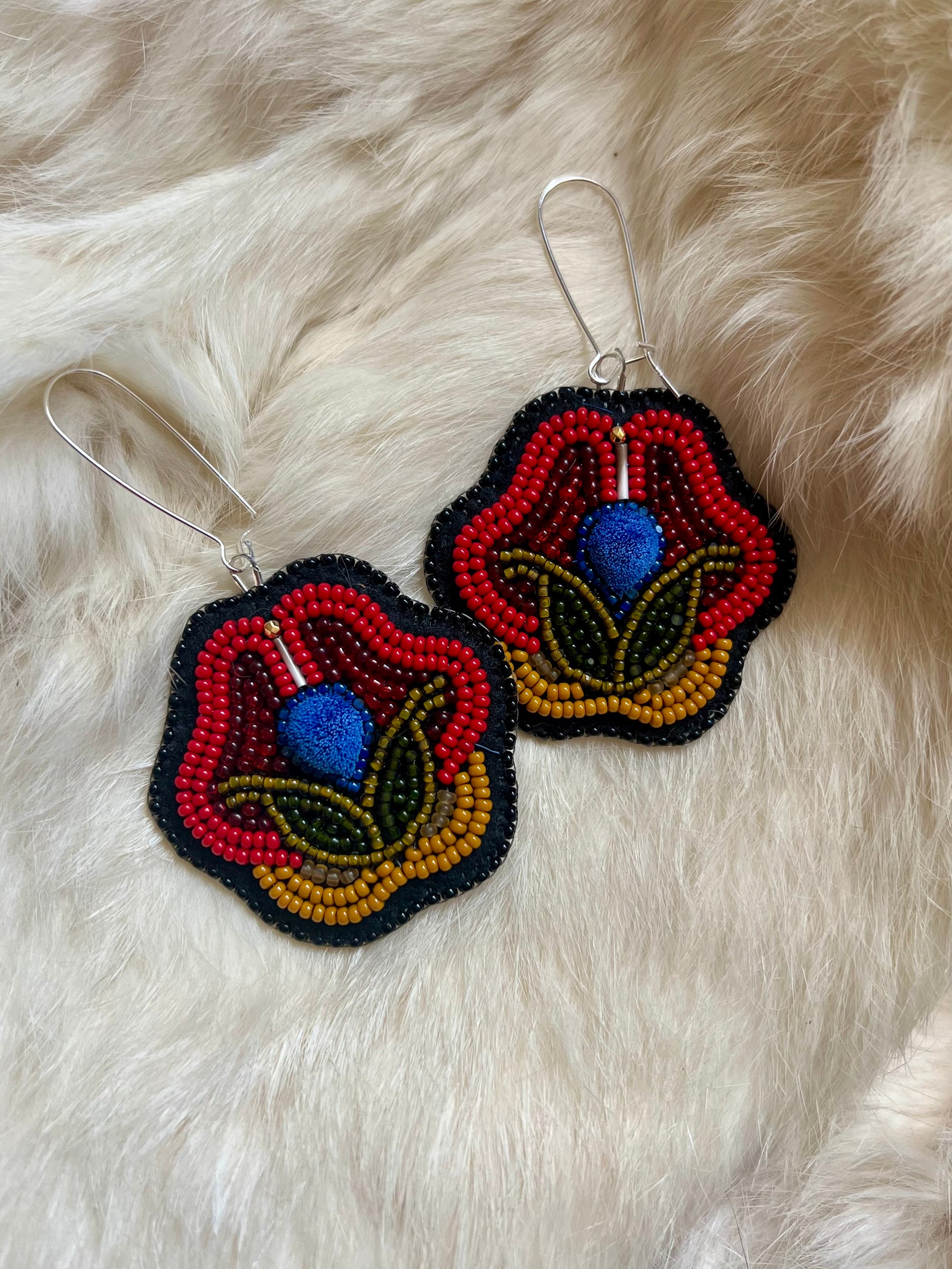 Hand beaded floral earrings with blue caribou hair tufted centre and porcupine quill detailing. These earrings are backed with home smoked deer hide & hang on sterling silver hooks.